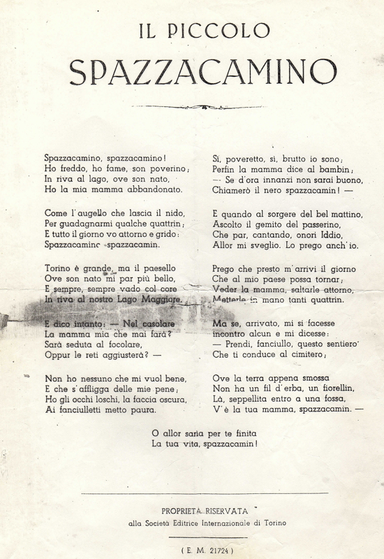 Ho 83 anni. Da bambino me la cantava mio padre a seguito dell’invito di mia madre: ” Vai a letto, viene anche il papà che ti racconta le fiabe! Più volte mi sono chiesto come avesse avuto modo di imparare questo canto e cantarmelo. Le cose, forse stanno così: mio nonno, negli anni di fine 1800 , ha frequentato, a Mogliano Veneto (TV) l’Istituto “Don Bosco” la scuola dei mestieri (falegname). Forse in questo Istituto cantavano questo canto. Mio nonno possedeva un pianoforte e forse è stato lui che lo ha insegnato a mio padre. Il Titolo di questo canto riportato sulla pagina è ” Il Piccolo spazzacamino. La stamperia è: ” Proprietà Riservata alla Società Editrice Internazionale di Torino”. (E. M. 21724) . – Nel testo Vostro ci sono 2 strofe (8 righe ) di testo che nel mio scritto non ci sono. Queste sono …” Se ho sete, bevo dell’acqua pura, …e termina con l’8va , ho un po’ di paglia…Mentre trovo che manca nel vostro testo la riga: ” LA’ SEPPELLITA ENTRO A UNA BARA,” che segue alla riga: Non ha un fil d’erba, un fiorelin,” Cosa che così completa il significato dell’intera frase. Ho avuto modo di farlo cantare nel 1970 nel mio paesello. Allora lo spartito mi era stato dato in prestito, così l’ho trascritto a mano e privo del testo sotto il pentagramma. Oggi, sfogliano dei libri, lo spartito è venuto tra le mani e naturalmente con i ricordi sopra elencati. Per avere certezza del mio spartito, se integro , ho “sfogliato” Internet e sono capitato a Voi.