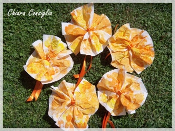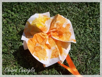 La coccarda è un lavoretto semplice che ho realizzato con il mio bimbo di 4 anni; si presta ad essere utilizzata per decorare la classe, i tavoli di una festa o per realizzare una ghirlanda fuori porta. Vista la stagione ho usato le tonalità dell’arancio e del giallo, ma se usate il rosso, diventano decorazioni natalizie.