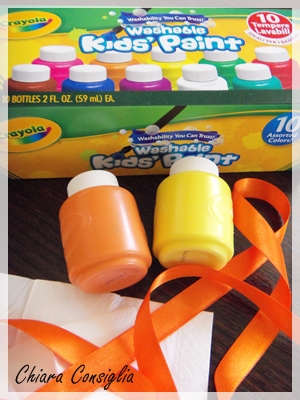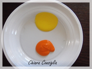 Innanzitutto preparate il piano di lavoro, ricordatevi che lavorate con bambini e nulla è lasciato al caso. Tovaglia in gomma lavabile se siete a casa, fogli di giornale se siete a scuola; usate vecchie camicie o grembiulini per i bambini, io al mio ho fatto indossare il grembiulino Crayola. Su un piattino in plastica preparate le tonalità di colore, due al massimo per coccarda.