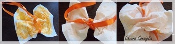 Appendete i fazzoletti su uno stendibiancheria e lasciateli asciugare. Ci vorrà un po’ di tempo, intanto preparate i nastri in raso per chiudere le coccarde.