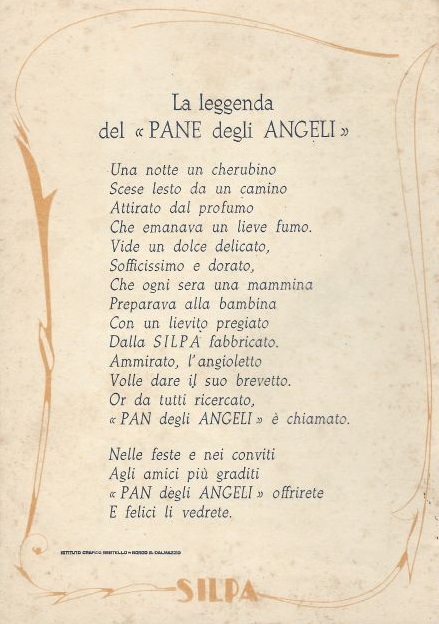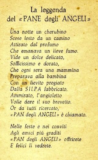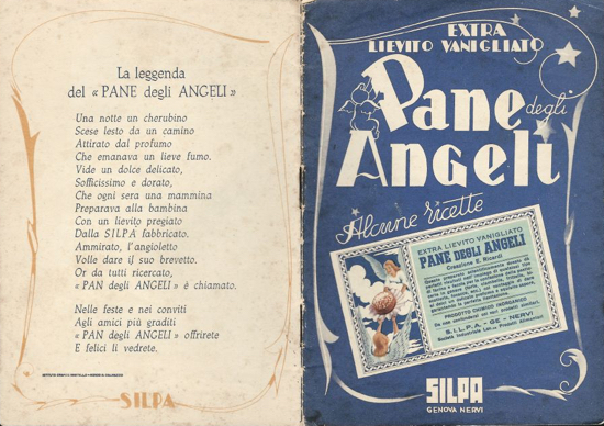 Questa filastrocca è stata scritta dall’inventore del lievito “Pan degli Angeli” Ettore Riccardi per raccontare il suo prodotto. Era stampata su un piccolo ricettario la cui prima edizione risale al 1939 o 1940. Negli anni il ricettario fu poi ampliato e più volte ristampato.