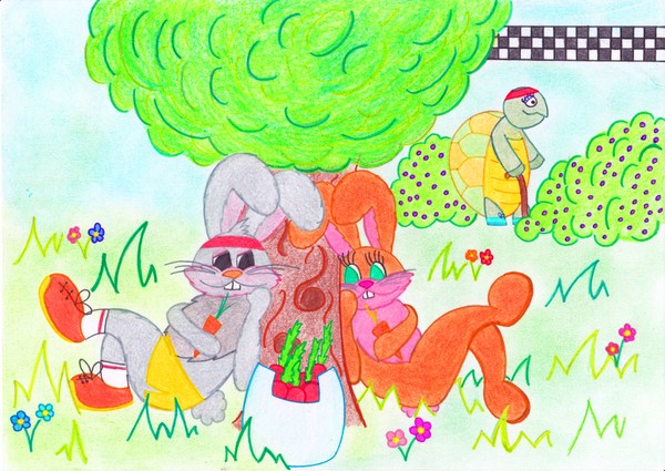 Virgilio, come d’abitudine, partiva di gran carriera, ma attraversando l’orto, il suo sguardo veniva attratto da una succosa carota che faceva capolino dal terreno. “Beh, se mi fermo un attimo a gustarmi la carota, che sarà mai? La mia avversaria è così lenta…”. Quindi, soddisfatto l’appetito, il coniglio ricominciava a correre, ma poco più in là, ad una svolta del sentiero, si imbatteva in Lisetta, graziosa coniglietta dai grandi e languidi occhioni, che non vedeva da tempo.