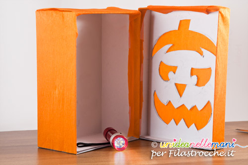 Usando una scatola da scarpe e un po’ di carta colorata, io ho costruito una zucca luminosa in pochi minuti e senza sporcarmi le mani.