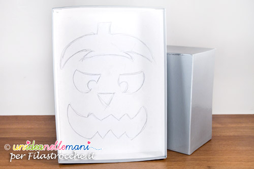 Per fare la lanterna disegna sul coperchio della scatola la sagoma di una zucca con occhi naso, bocca e calotta.