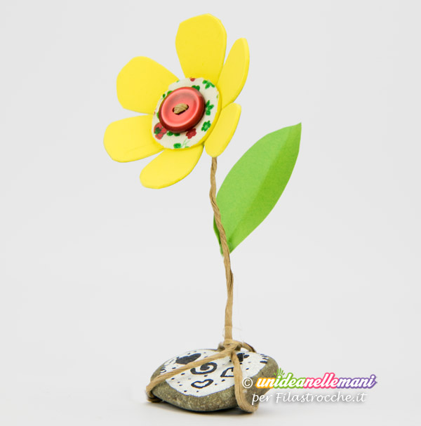 In pratica si tratta di realizzare un fiore in 3d a otto petali in gomma crepla (o in cartoncino colorato) e di fissarlo ad un sasso tramite un filo animato. I bambini si divertiranno a ritagliare il fiore, prepararne il gambo e decorare il sasso a piacere con colori acrilici o pennarelli indelebili.