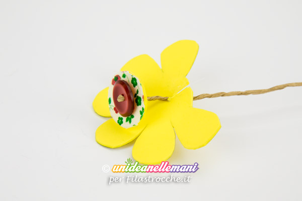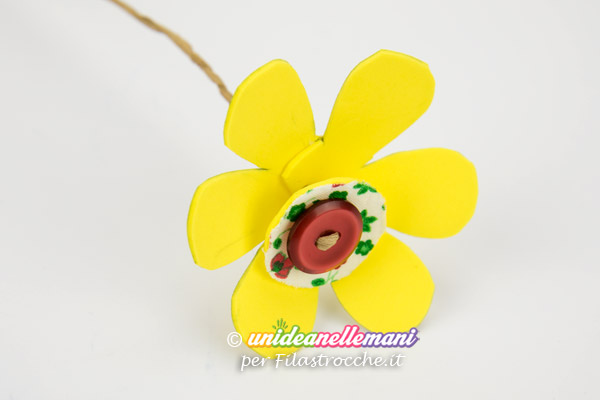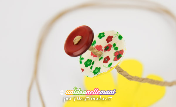 A questo punto crea il gambo del fiore infilando il filo animato su un bottone e poi in mezzo ad un dischetto di gomma crepla su cui avrai incollato un pezzetto di stoffa in fantasia.