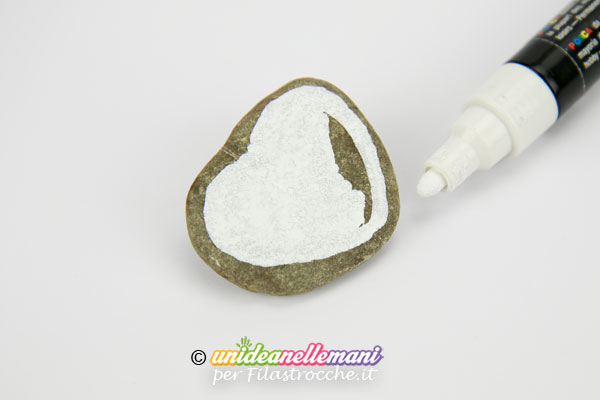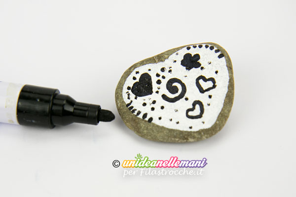 Adesso colora il sasso di bianco o nei colori che preferisci e decoralo a piacere con cuoricini, fiori o scritte.