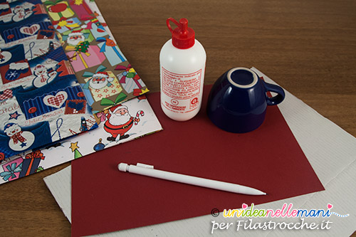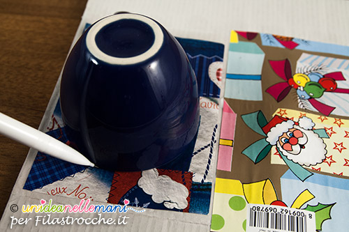 Aiutandoti con un oggetto circolare (io ho utilizzato una tazzina da caffè) disegna un cerchio sopra ognuna delle tre carte natalizie.
