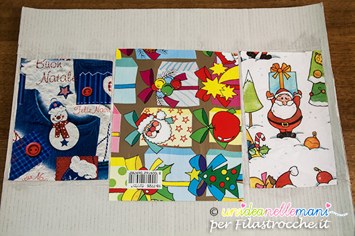 Ritaglia tre pezzettini di carta da regalo natalizia e incollali uno vicino all’altro sul cartoncino rigido (va bene quello ondulato dei biscotti o quello di una scatola da scarpe).