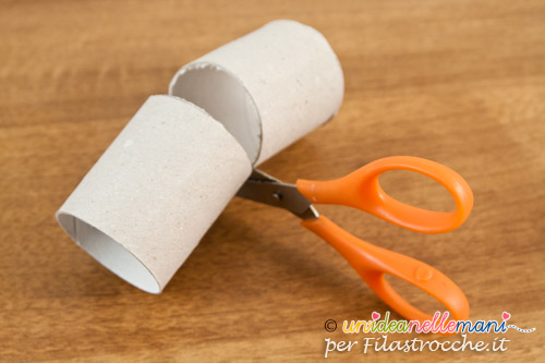 Taglia a metà il tuo tubo di cartone (vanno bene quelli della carta igienica o anche quelli dei rotoloni da cucina) lasciando solo un piccolo pezzettino di cartone non tagliato (basta uno o due centimetri).