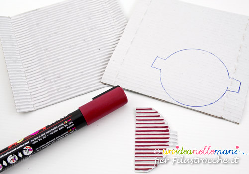 Colora le righe in rilievo con un pennarello e poi taglia a metà i cerchi (vedi foto sotto).