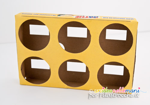 Per fare le persiane taglia, nel cartoncino dei biscotti, sei cerchi con delle piccole alette laterali (vedi foto sotto).