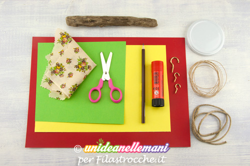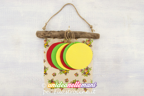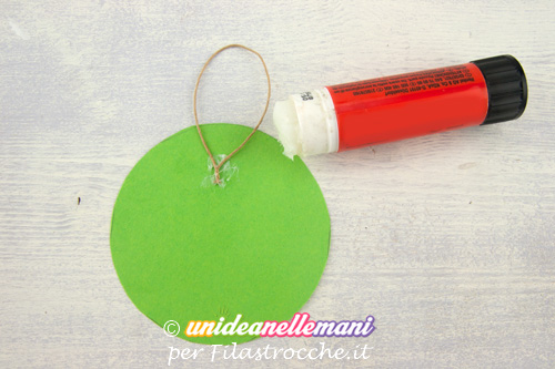 Per creare l’anello per appendere i dischetti, taglia un pezzettino di spago, fai un cappio e incollane la coda sul retro del cartoncino.