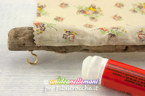 Taglia un quadratino di stoffa lungo una ventina di centimetri e e un po’ più stretto del legnetto e incollalo dietro al legnetto.