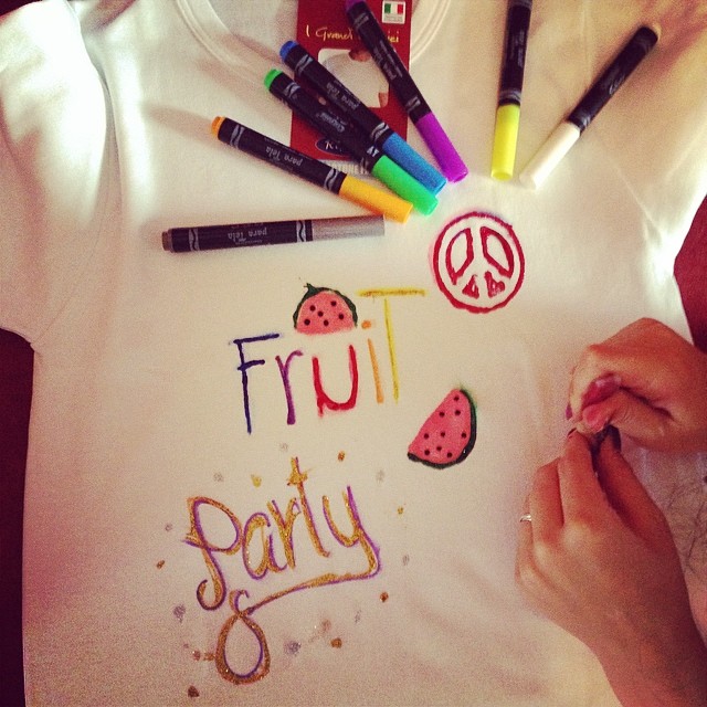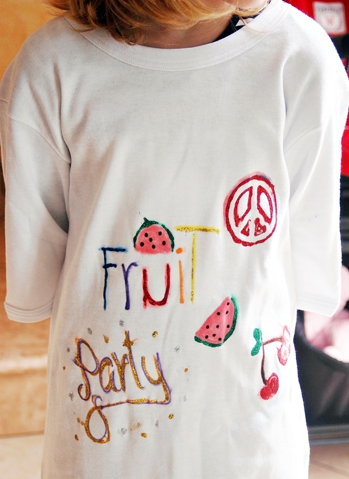 Ecco a voi l’idea di Valentina, sedici anni, fatta insieme all’aiuto di Biagio e Michelle, 4 e 7 anni, una maglietta come gadget da regalare a chi veniva al party.