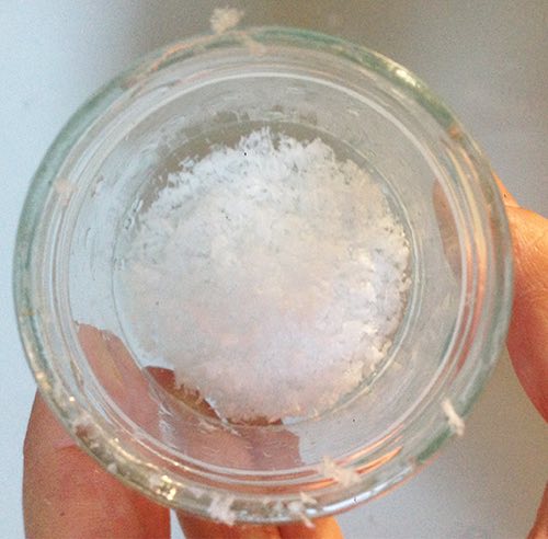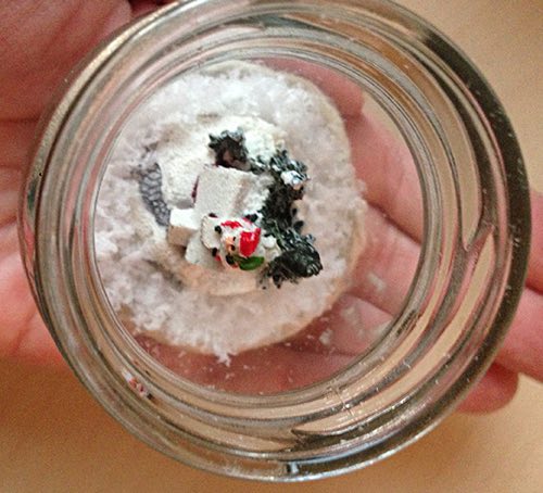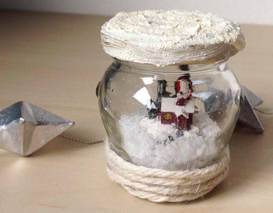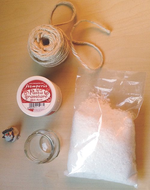 Inserire la neve finta per un terzo del vasetto e comunque oltre il bordo realizzato esternamente con la corda di juta.