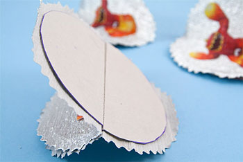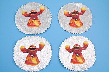 Prendere i dischi di carta crespa e incollare sul davanti i personaggi skylanders e sul dietro il dischetto di cartoncino