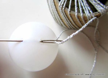 Con l’ago da lana fai due forellini ravvicinati sulla pallina da ping pong e poi fai passare il filo argentato e chiudilo ad asola con un nodino.