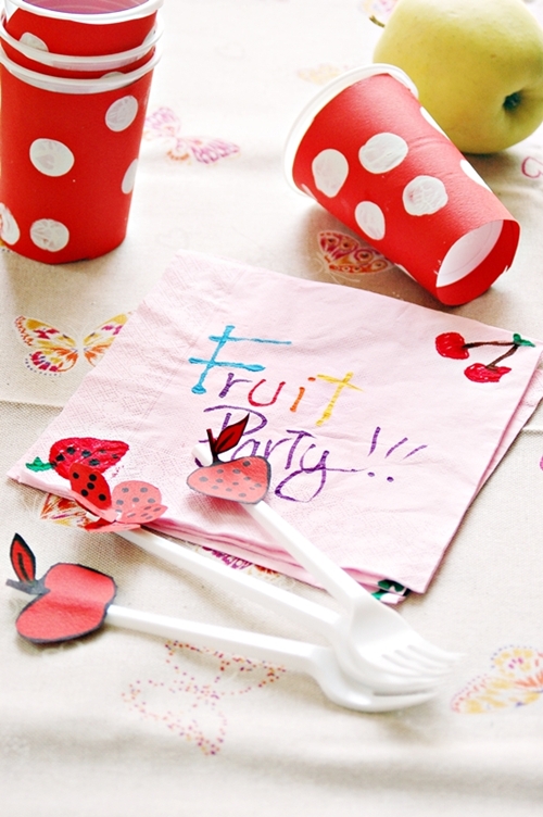 Posate in plastica decorate con dei cartoncini ritagliati a forma di frutta, bicchieri di plastica ricoperti con del cartoncino e decorati a pois bianchi e tovaglioli di carta rosa, con la scritta e i disegni della maglietta.