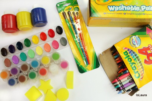 -tempere lavabili assortite, acquerelli, colori a tempera, set di pennelli, stampini di varie forme, tutto Crayola,