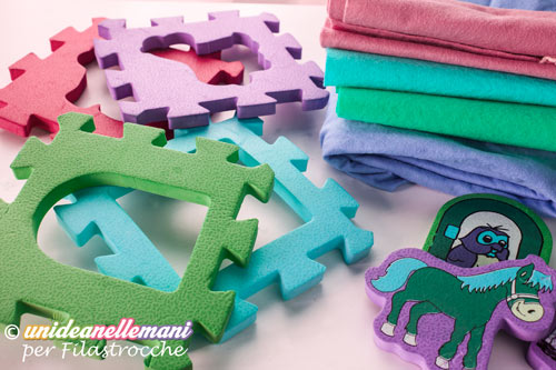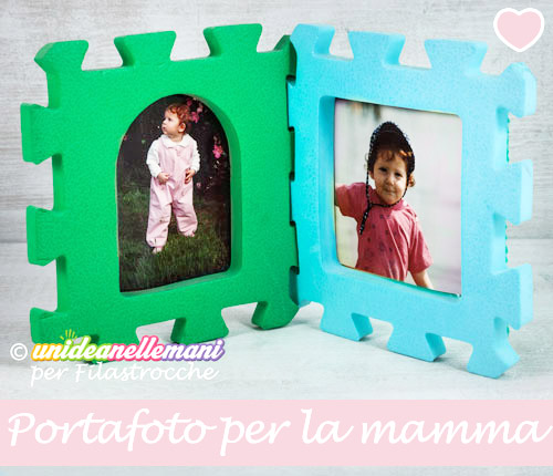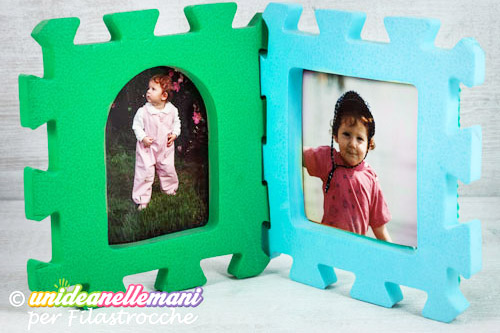 Il lavoretto è estremamente facile e veloce e permette di creare con pochi materiali un originale portafotografie fai da te morbido e colorato riciclando le mattonelle gommose con cui i bambini hanno giocato da piccoli.