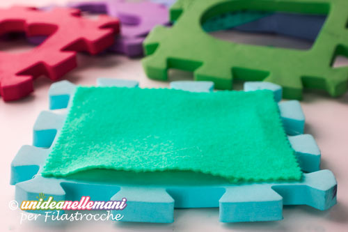Ritaglia un quadrato di stoffa (va benissimo un po’ di pannolenci) per ogni mattonellina gommosa che utilizzerai per il portafotografie.