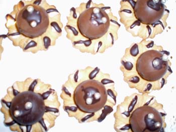 Usare il cioccolato fuso per attaccare i cioccolatini sul buco dei biscotti, per attaccare gli occhietti in alto e per disegnare le zampine dei ragnetti.