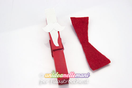Per realizzare il cappello da mettere sul segnaposto, ritaglia sul pannolenci rosso due triangoli con la base un po’ più larga della molletta di legno e poi incollali prima tra di loro e poi sulla cima della molletta in corrispondenza della testa del Babbo Natale.