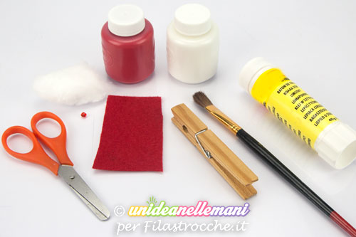 Colora di rosso la molletta con della tempera rossa, cercando di stendere il colore in modo da ricoprirla uniformemente.