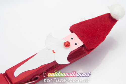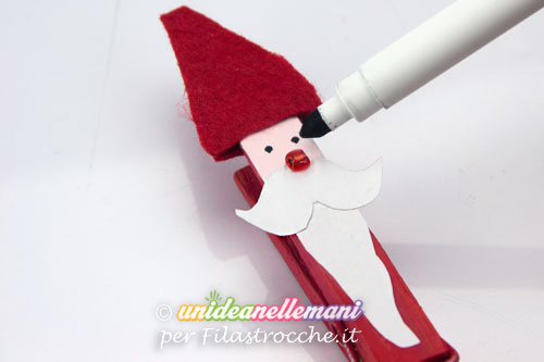 Appena il colore si è asciugato, incolla sulla molletta la strisciolina di carta che avrai sagomato come fosse la lunga barba di un Babbo Natale