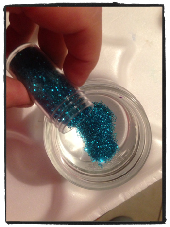 Riempite d’acqua il vasetto di vetro e versate un po’ di glitter di diversi colori, stando attenti a non esagerare coi brillantini. Io ho utilizzato i glitter blu e azzurri.