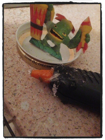 Prendete il vostro personaggio Skylander e con un po’ di colla a caldo fissatelo in piedi sotto il tappo. State attenti che sia ben fissato.