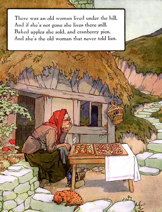 There was an old woman lived under the hill, And if she’s not gone she lives there still. Baked apples she sold, and cranberry pies, And she’s the old woman that never told lies.