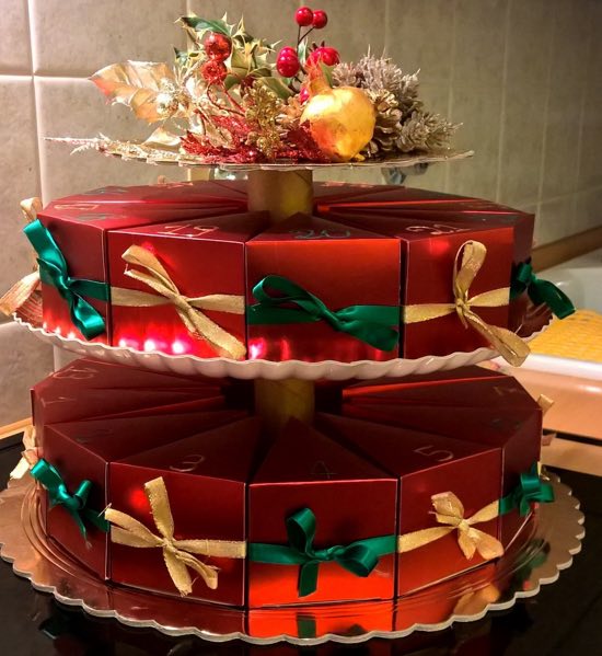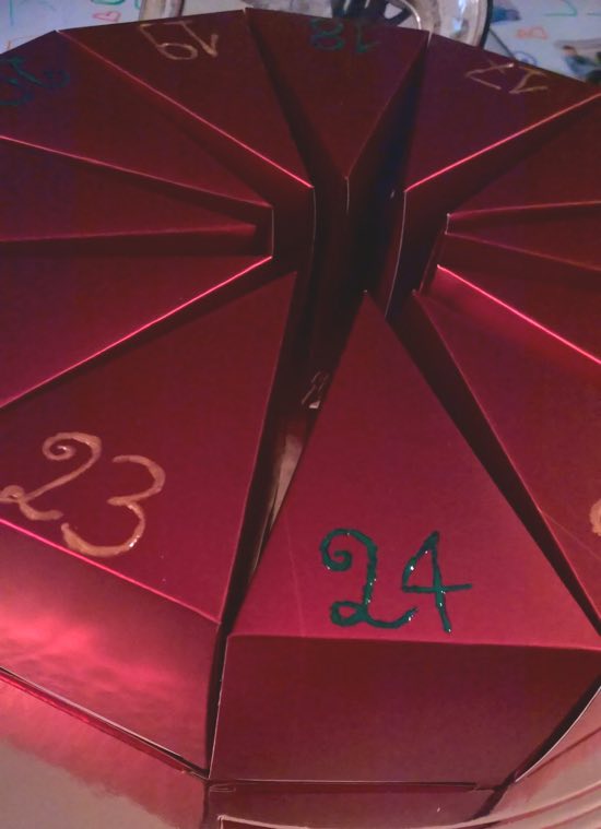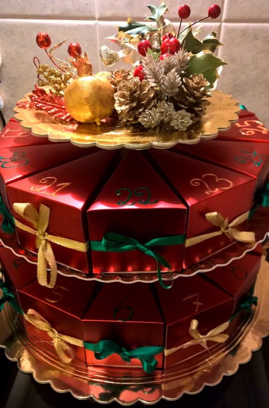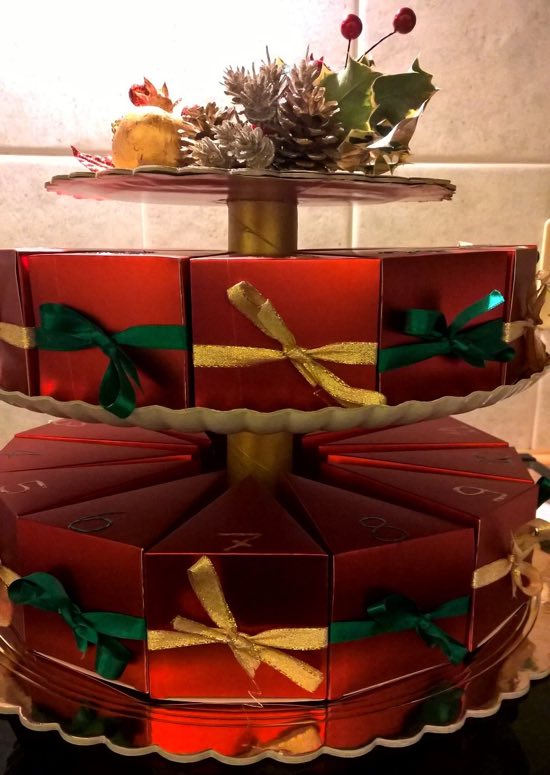 Sopra ogni fetta è stato messo il numero del giorno dal 1 al 25 dicembre e ogni fetta è stata naturalmente riempita di dolciumi, pensierini e preghiere.