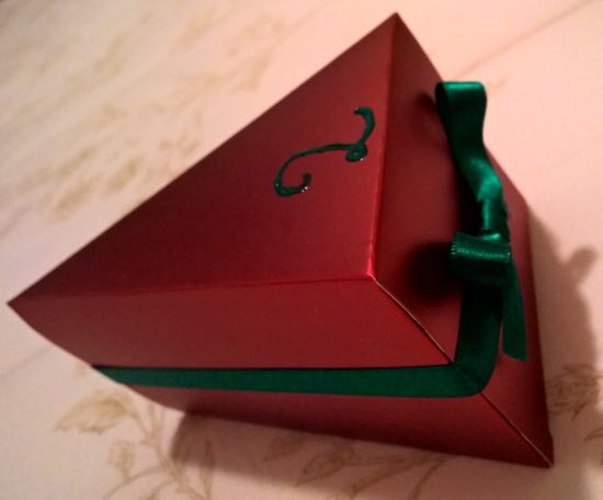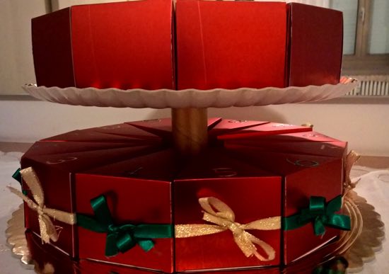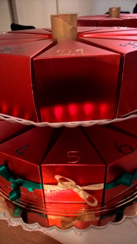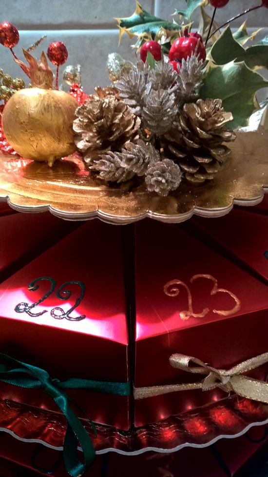 Il calendario è stato fatto con delle scatole rosse di cartone a forma di fette di torta decorate con nastro e numero in oro e verde.