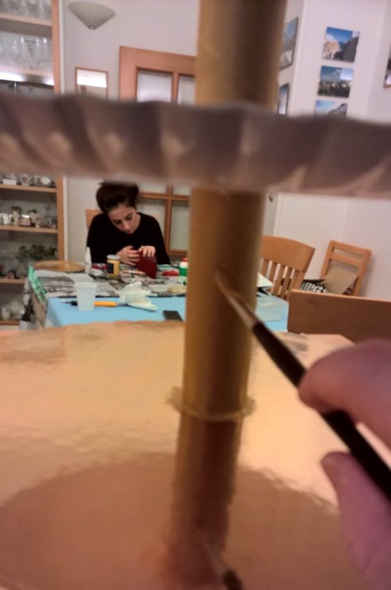 Una volta finito di preparare le varie fette sono state sistemate su dei vassoi dorati di dimensioni diverse tenuti insieme da un tubo di rotolo scottex dipinto di oro .