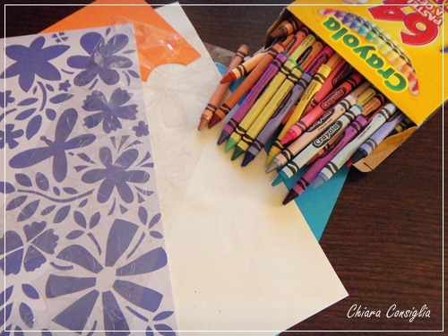 Iniziate con il ritagliare un rettangolo di carta bianca, poco più piccolo del segnalibro che vorrete ottenere. Posizionate la mascherina per lo stencil, e iniziate a colorare con i pastelli; meglio se posizionate il lavoro in modo che le foglioline o i fiori siano incompleti. Scegliete colori che stiano bene insieme.