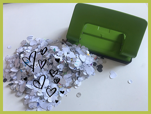 Se volete che i vostri coriandoli siano davvero speciali, utilizzate i perfora- carte con le formine che di solito non mancano mai tra gli attrezzi dei bimbi. Il nostro era a forma di cuoricino.