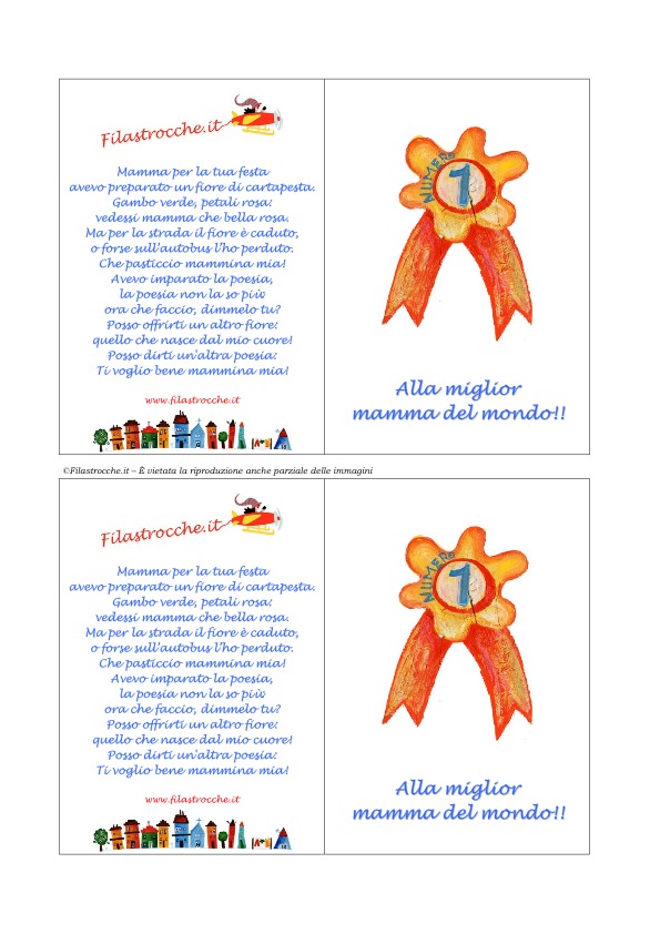 Un bellissimo biglietto d’auguri per la Festa della Mamma, da stampare e ritagliare con il premio e la filastrocca, di Filastrocche.it.