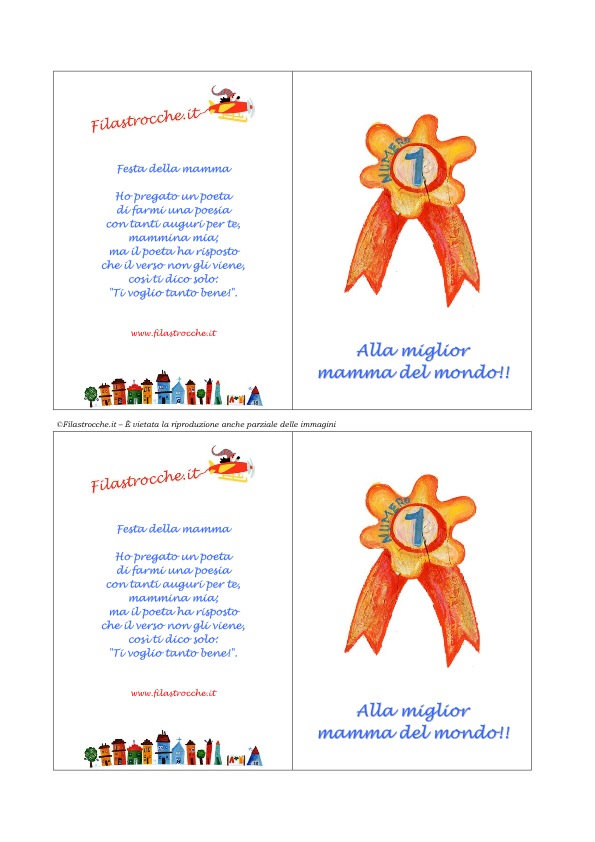 Un bellissimo biglietto d’auguri per la festa della Mamma, da stampare e ritagliare con il premio e la filastrocca del poeta, di Filastrocche.it.