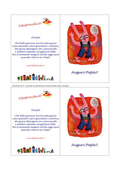 Ecco un simpatico biglietto per la Festa del Papà. Un originale coniglietto di Filastrocche.it per fare gli auguri al tuo papà, nel giorno della sua Festa. Averlo è facile: stampa e ritaglia!