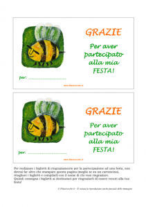 Grazie per aver partecipato alla mia festa! Ecco un bellissimo biglietto di ringraziamento con l’ape originale di Filastrocche.it