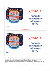 Grazie per aver partecipato alla mia festa! Ecco un bellissimo biglietto di ringraziamento con la torta originale di Filastrocche.it