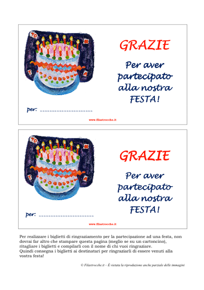 Grazie per aver partecipato alla nostra festa! Ecco un bellissimo biglietto di ringraziamento con la torta originale di Filastrocche.it