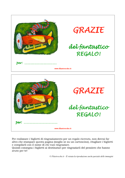 Grazie del fantastico regalo! Per ringraziare amici e parenti per i regali ricevuti, ecco un bellissimo biglietto di ringraziamento con l’aereo originale di Filastrocche.it
