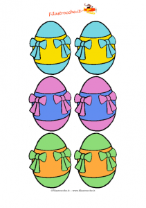 Per decorare il tuo Albero di Pasqua, ecco le Uova con i fiocchi colorati. Ti occorrono un ramo d’albero, del nastro colorato, colla o pinzatrice, forbici, cartoncino bianco. Stampa, ritaglia, piega a metà, incolla le due parti e pratica un forellino in alto, dove farai passare il nastro colorato. Ora puoi appendere le uova all’albero. Puoi utilizzare queste decorazioni anche come bigliettini chiudipacco per i tuoi regali di Pasqua, o come segnaposto a tavola. Buona Pasqua!