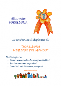Alla Sorellona migliore del mondo! Per fare un regalo simpatico e originale, stampa il diploma di Filastrocche.it, firmalo, arrotolalo e decoralo con un nastrino colorato. E regalalo a tua sorella maggiore. Sarà contenta!