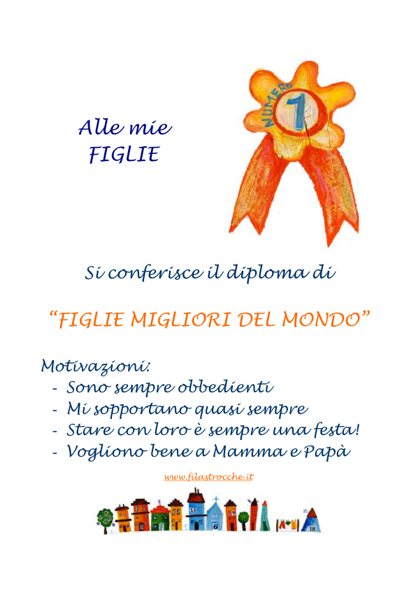 Alle Figlie migliori del mondo! Per fare un regalo simpatico e originale, stampa il diploma di Filastrocche.it, firmalo, arrotolalo e decoralo con un nastrino colorato. E regalalo alle tue figlie. Saranno contente!