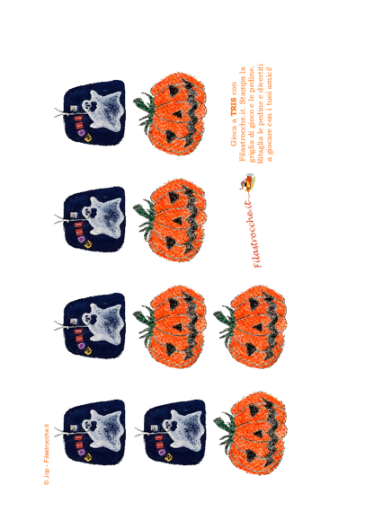 Chi non conosce il gioco del tris? Divertitevi durante Halloween a realizzarlo con le vostre mani e a giocare con gli amici. Stampate la griglia e la pagina delle pedine, ritagliate le pedine e iniziate a giocare! Regole del gioco: Disporre la griglia di gioco su un piano. Ogni giocatore ha 5 pedine, scopo del gioco è quello di riuscire a mettere tre pedine in fila nella griglia, in orizzontale, verticale o diagonale. I due giocatori giocano a turno, disponendo una pedina alla volta durante ogni turno di gioco. Vince chi per primo riesce a fare TRIS!
