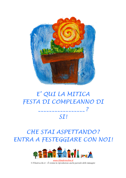 Filastrocche.it vi regala il mini poster con il vaso di fiori, da appendere sulla porta di casa o nel luogo dove si sta svolgendo la vostra Festa di Compleanno! Stampatelo, compilatelo con il nome del festeggiato e appendetelo. Auguri di Buon Compleanno!